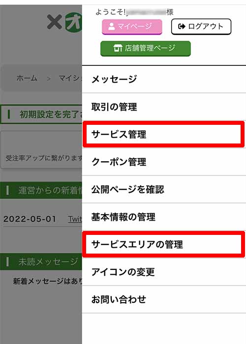 サービス地域の登録及びメニューの「サービスの管理」でサービスの登録が1件以上ないと店舗情報が公開されませんので必ず登録をして下さい。